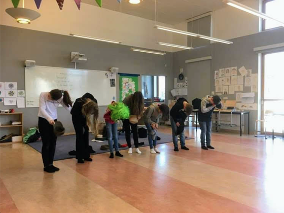 Eleverna har fått träna på olika delar i en form som binder samman de olika övningarna de jobbat med under workshoparna med Ida och Andréa. Eleverna fick inta platsen för uppspelet, skolans gympasal!