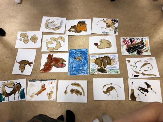 Sedan gjorde vi konst av kaffefläckar på papper. Vi skulle föreställa oss att fläcken var ett djur och måla det. Det blev både fiskar, katter, fantasidjur och ett corona-virus!