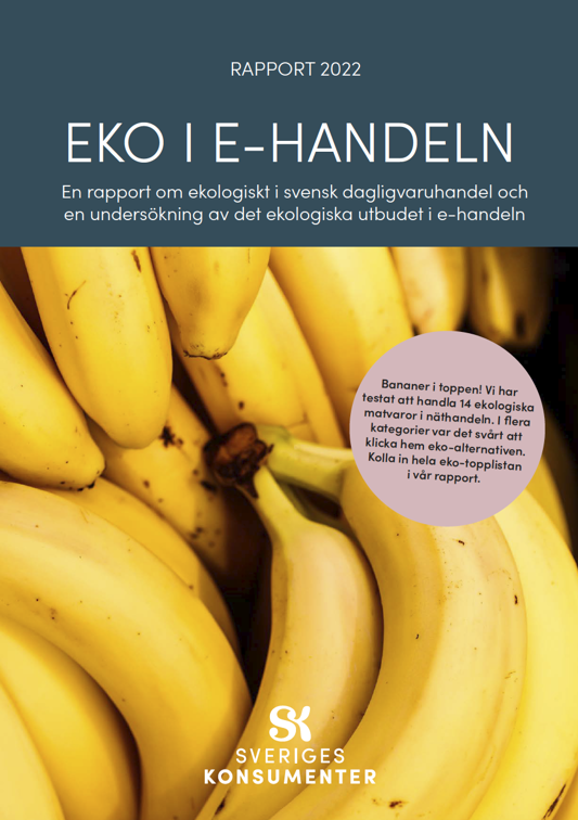 Att göra sina matinköp på nätet blir allt vanligare. Men hur lätt det är att hitta ekologiska alternativ varierar stort. Av 14 vanliga matvaror som Sveriges Konsumenter tittat närmare på så ligger eko-bananerna i topp. I genomsnitt är 73 procent av bananerna i de granskade nätbutikerna eko. I botten ligger chips där bara en (!) procent är ekologiska. Nästan lika illa är det bland den frysta vegetariska färdigmaten där bara tre procent av maträtterna är eko.