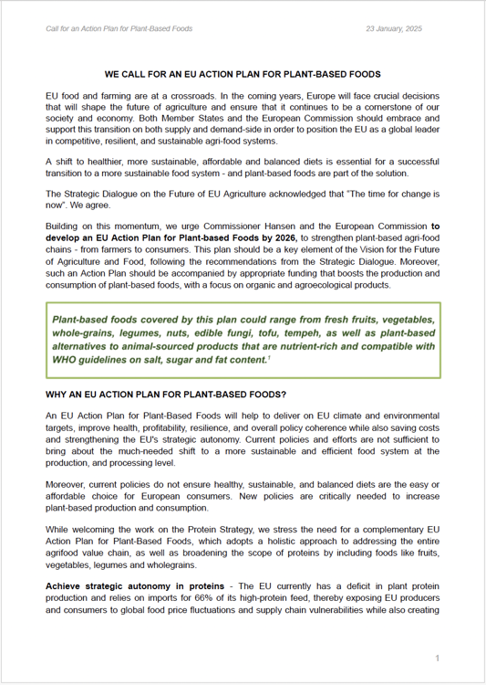 Handlingsplanen skulle kunna inspireras av den danska växtbaserade handlingsplanen med organisationerna som hävdar att den skulle ställa växtbaserade livsmedel på mer jämställdhet med djuruppfödning, vilket ger potentialen att stärka Europas självständighet och stödja diversifiering för jordbrukare.