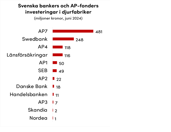 Totalt investerar svenska banker och AP-fonder 1,1 miljarder kronor i fem av de sex största köttbolagen i världen. Det är en minskning med en fjärdedel jämfört med 2023 då rapporten Cruel Investments avslöjade företagens bristande djurvälfärd, koppling till skogsskövling och stora klimatutsläpp. Efter rapporten protesterade tusentals svenska bankkunder genom att skicka brev till sina banker, något som verkar ha haft effekt.