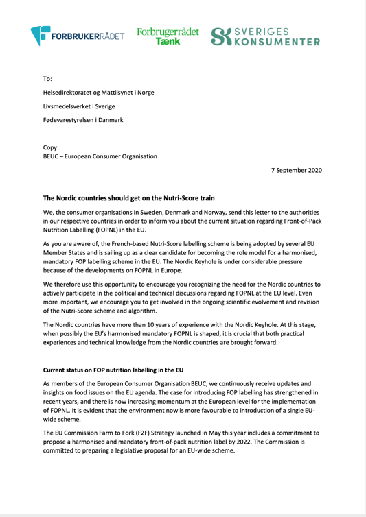 We, the consumer organisations in Sweden, Denmark and Norway, send this letter to the authorities in our respective countries in order to inform you about the current situation regarding Front-of-Pack Nutrition Labelling (FOPNL) in the EU.