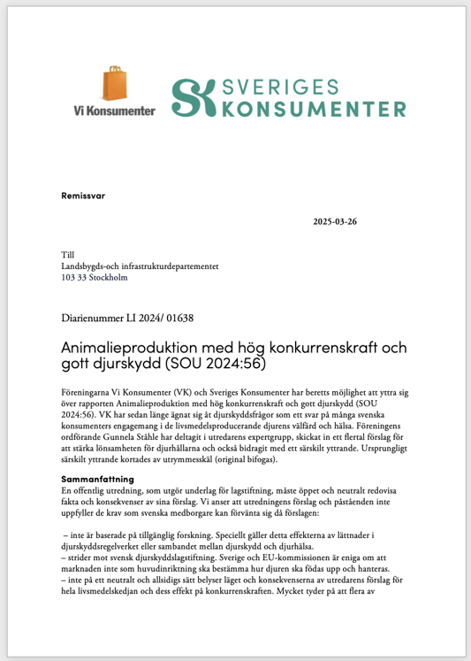 Föreningarna Vi Konsumenter (VK) och Sveriges Konsumenter har beretts möjlighet att yttra sig över rapporten Animalieproduktion med hög konkurrenskraft och gott djurskydd (SOU 2024:56). VK har sedan länge ägnat sig åt djurskyddsfrågor som ett svar på många svenska konsumenters engagemang i de livsmedelsproducerande djurens välfärd och hälsa. Föreningens ordförande Gunnela Ståhle har deltagit i utredarens expertgrupp, skickat in ett flertal förslag för att stärka lönsamheten för djurhållarna och också bidragit med ett särskilt yttrande. Ursprungligt särskilt yttrande kortades av utrymmesskäl (original bifogas).