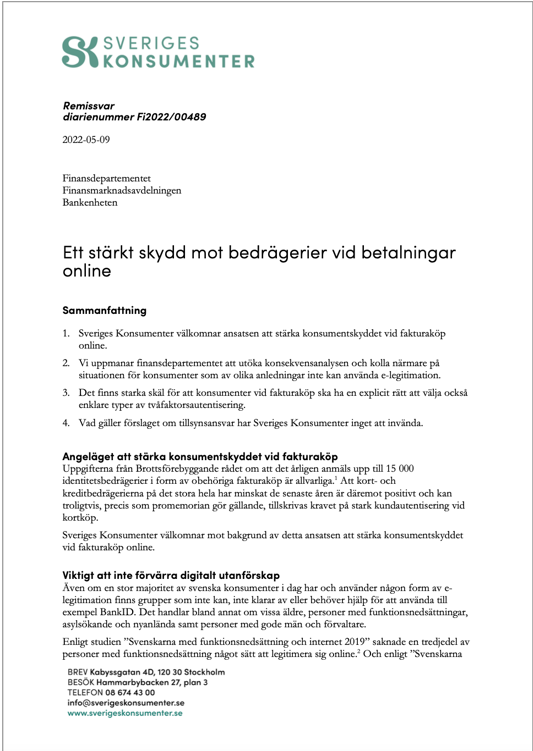 Sveriges Konsumenter vill mot bakgrund av ovanstående uppmana att noggrant se över hur kravet på stark kundautentisering vid fakturaköp påverkar grupper som redan i dag lever i eller på gränsen till digitalt utanförskap.