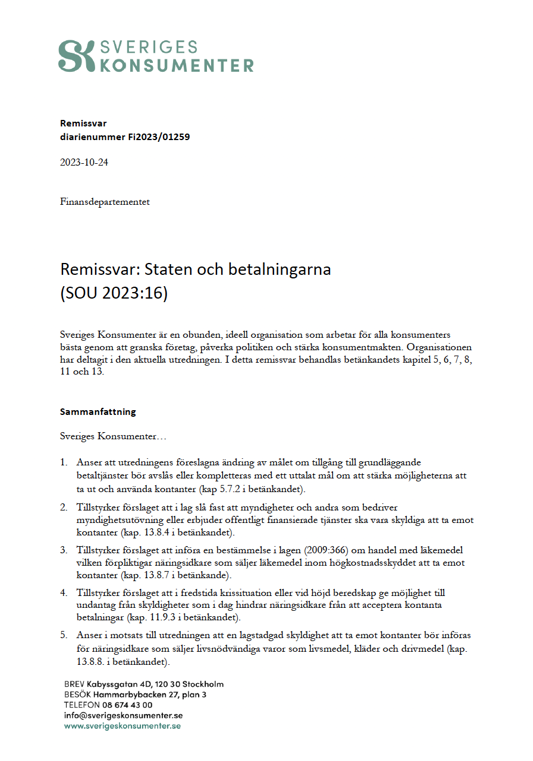 Dessutom anser Sveriges Konsumenter att utredningens föreslagna ändring av målet om tillgång till grundläggande betaltjänster bör avslås eller kompletteras med ett uttalat mål om att stärka möjligheterna att ta ut och använda kontanter.