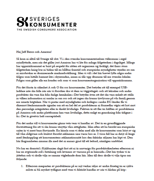 Så kom ni alltså till Sverige till slut. Vi i den svenska konsumentrörelsen välkomnar i regel nyinflyttade, men när det gäller just Amazon har vi lite för många frågetecken i dagsläget. Många har uppmärksammat er brist på respekt för rätten att organisera sig fackligt, det finns stora frågetecken kring hur ni bidrar till en hållbar framtid och europeiska myndigheter utreder nu om ni missbrukar er dominerande marknadsställning. Men vi vill i det här brevet lyfta några andra frågor som hittills hamnat lite i skymundan, innan ni slår upp dörrarna till era svenska lokaler. Frågor som gäller alla era kunder och som vi som konsumentorganisation vill uppmärksamma.