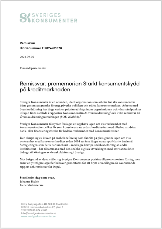 [2] Remissvar: Ett förstärkt konsumentskydd mot riskfylld kreditgivning och överskuldsättning, 2023