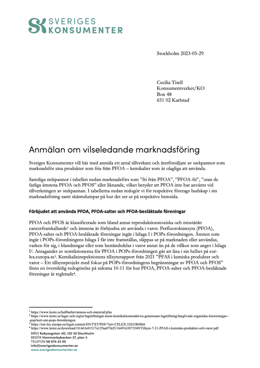 - Det ska klassas som vilseledande marknadsföring att skriva ”fri från PFOA”. Dessa budskap ska bort.