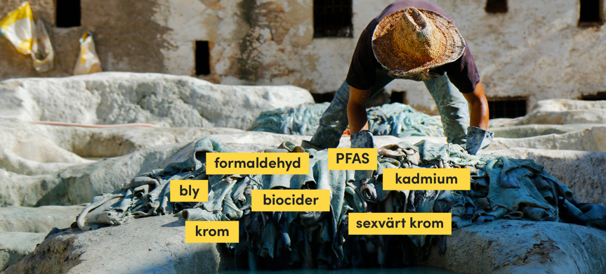 Andra skadliga kemikalier som kan förekomma i lädertillverkning är till exempel kadmium, bly, biocider, PFAS och formaldehyd.