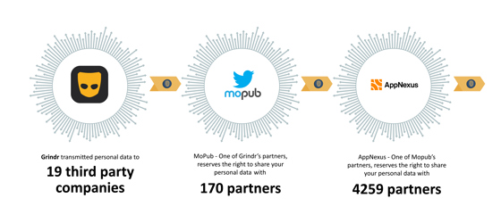 Här nedan kan du se hur persondata som matas in i appen Grindr sprids vidare i flera led via annonsnätverk: