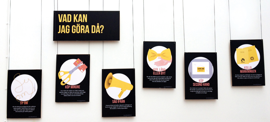 Utställningen Stilmedveten står under 2016 i Borås och Luleå. Här har dock alla möjlighet att ta del av utställningen i affisch-form. Affischerna följer utställningens upplägg med att följa ett plagg genom hela dess livscykel, från designfasen tills du själv har det hemma i garderoben, tvättar det och kanske tillsist tröttnar. Om du vill använda alla affischerna, sätt gärna upp dem i den här ordningen:
