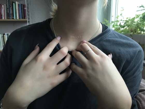 Ärren på halsen kommer hon att få leva med. Men de är inte det enda som påminner om den där morgonen.